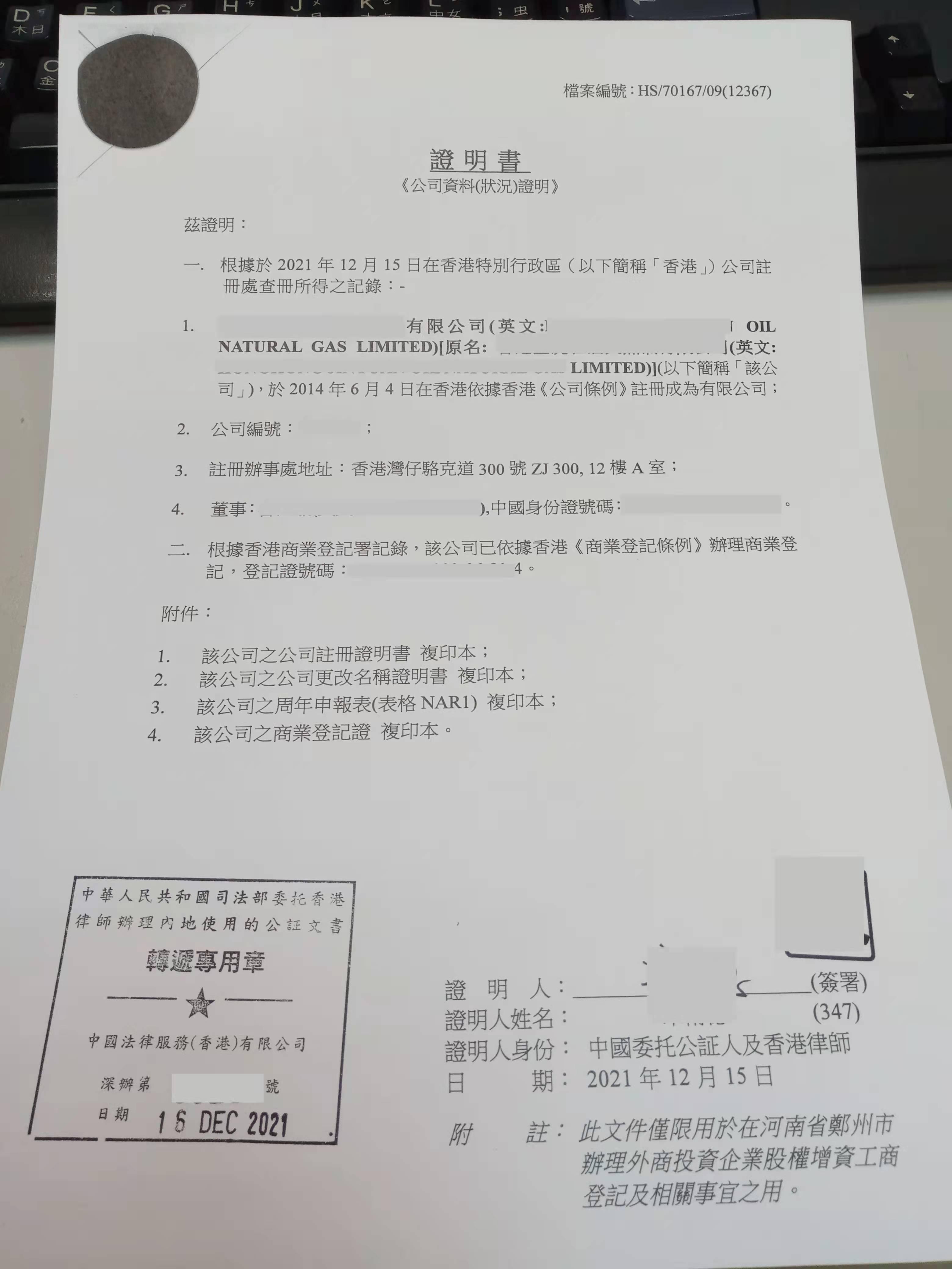 您办理香港公司资料的公证认证流程,由中国委托公证人公证+中国法律服务香港有限公司加盖转递章,时间为3-5个工作日。